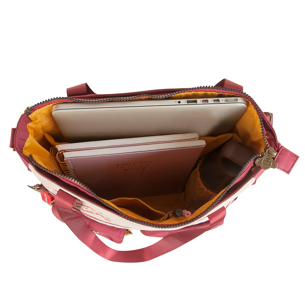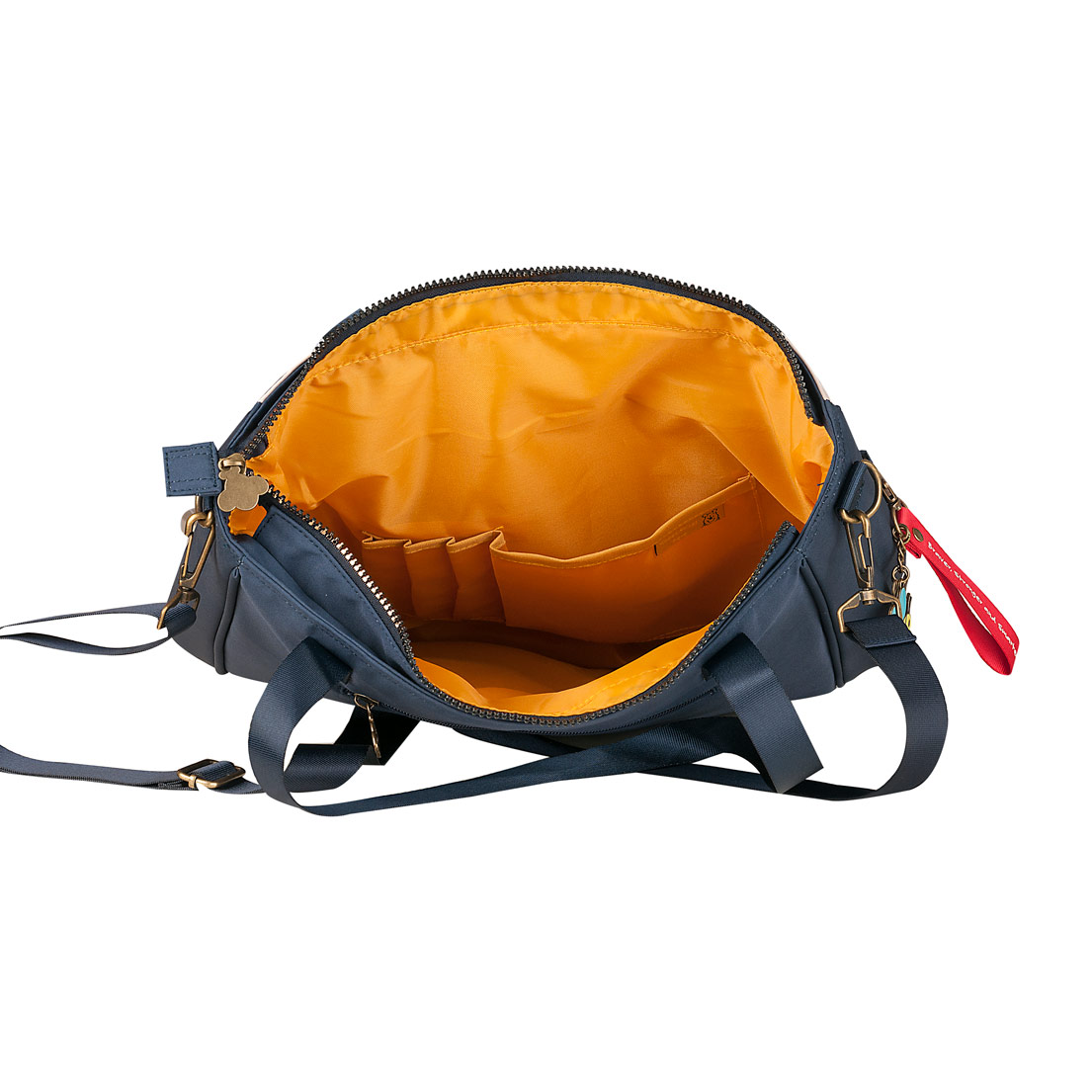 Personagem em poliéster soft bicolor, matelassê de colmeia, personagem estampado em line, strap acetinado listrado, bordado atoalhado, metais em vintage gold, puxadores e chaveiro personalizados.