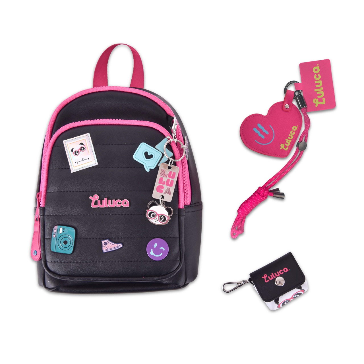 Caixa exclusiva incluindo uma mini mochila em PVC com aplicação de patches, logo em metal e metais em banho prata, Acompanha porta fone de ouvido personalizado, chaveiro com suporte para celular e mini espelho.