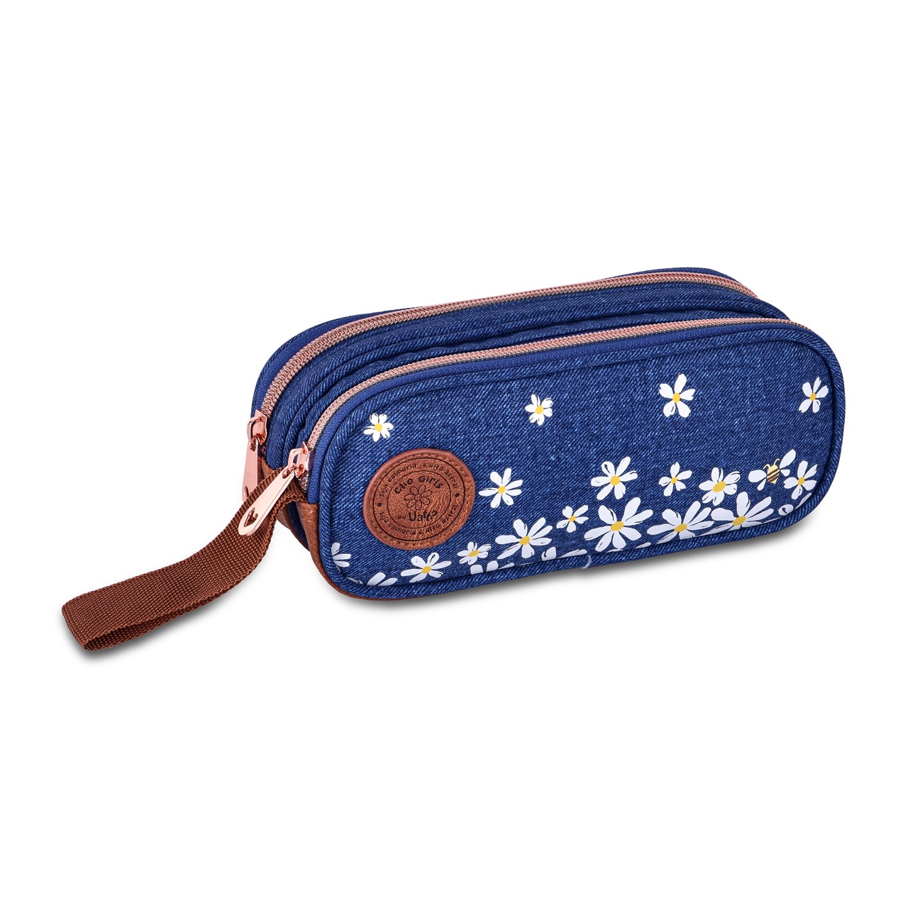 Confeccionadas em poliéster com estampa de jeans com detalhe de PVC, silk de florzinhas, zíper rose gold e etiqueta de PVC prensada.