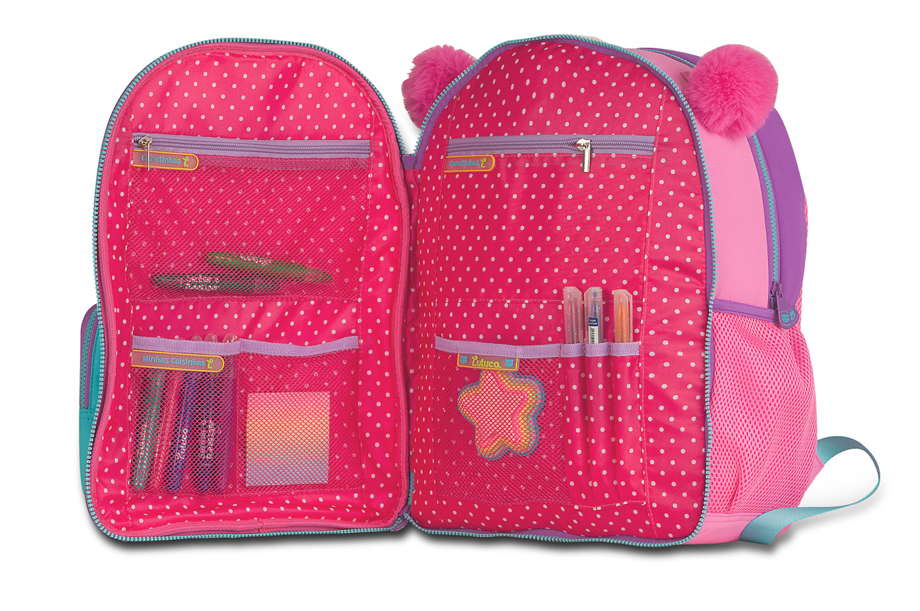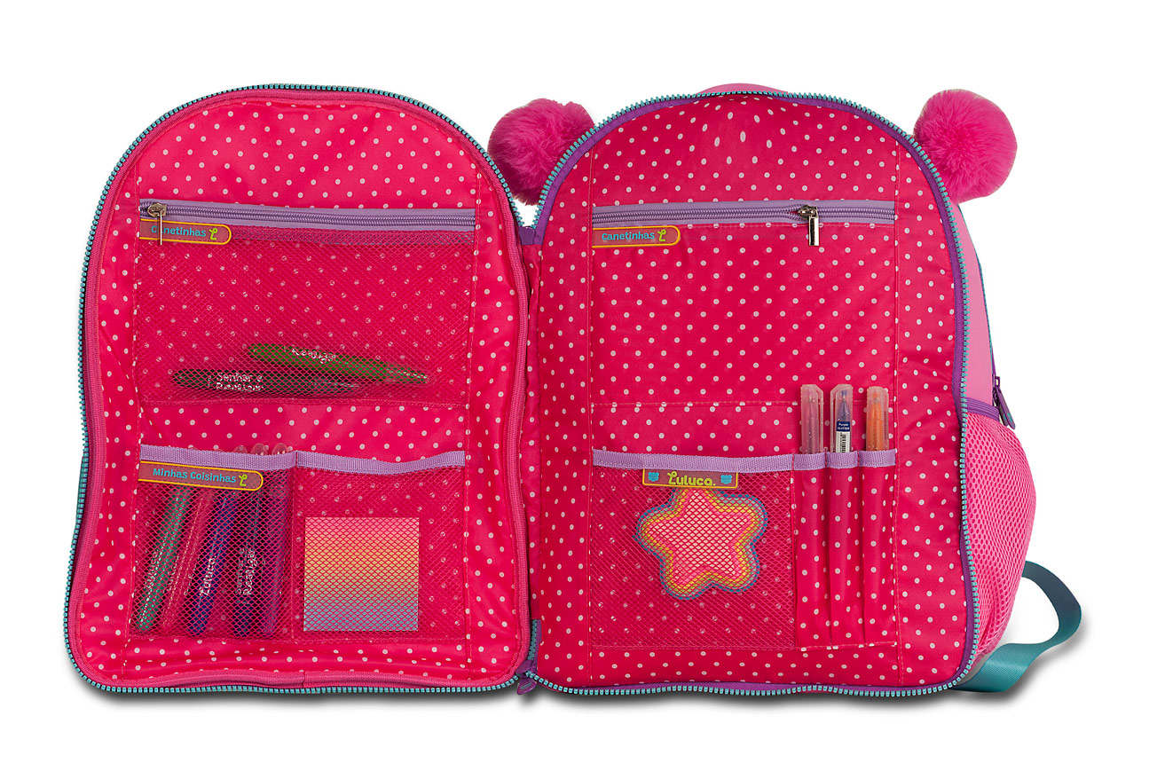 Confeccionadas em poliéster soft, strap acetinado, detalhes de silk prata e patches holográficos, possui dois pompons no topo e bolsinho de PVC. O primeiro zíper tem abertura lateral com painéis organizadores.