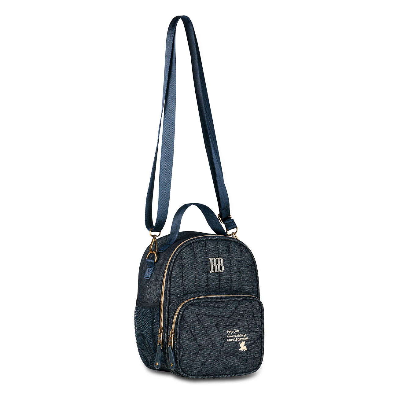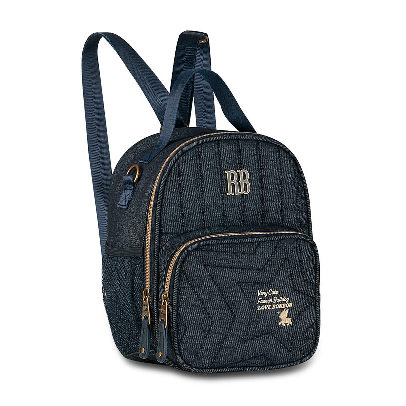 Confeccionadas em jeans com matelassê com detalhes em PVC e silk em ouro velho. Acompanha chaveiro de pompom com orelhinhas, plaquinhas de metal e correntinha com strass em ouro velho.
